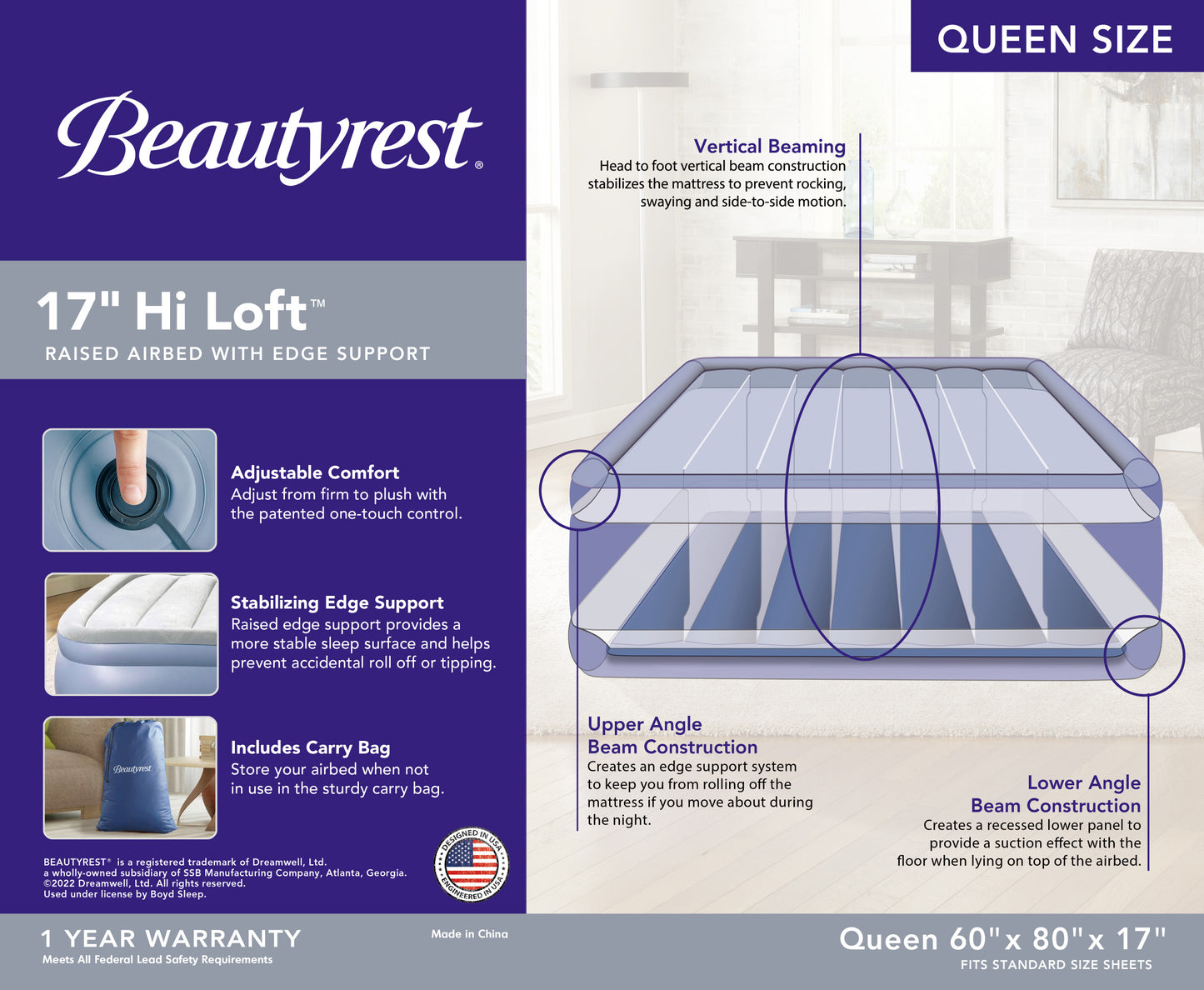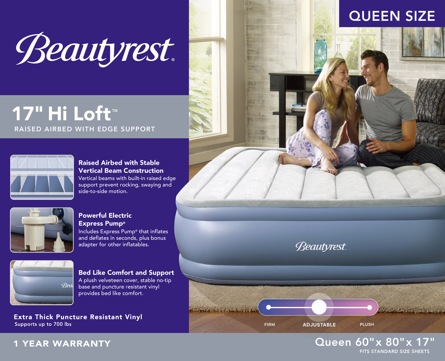 Fast and simple to inflate with the hands free Express Pump®, the Beautyrest® Hi Loft™ raised airbed offers great comfort and support when on the go or for guests at home.