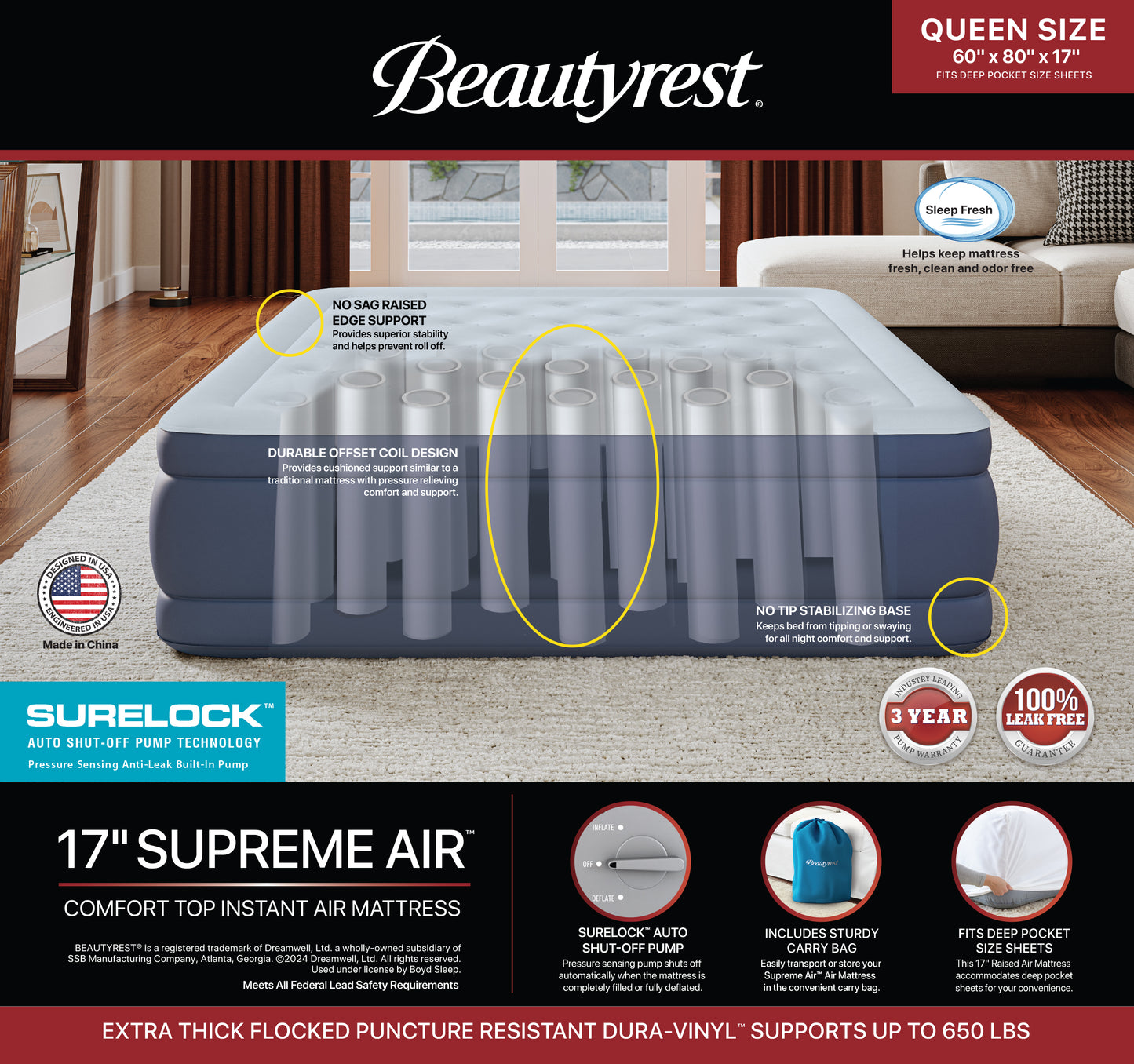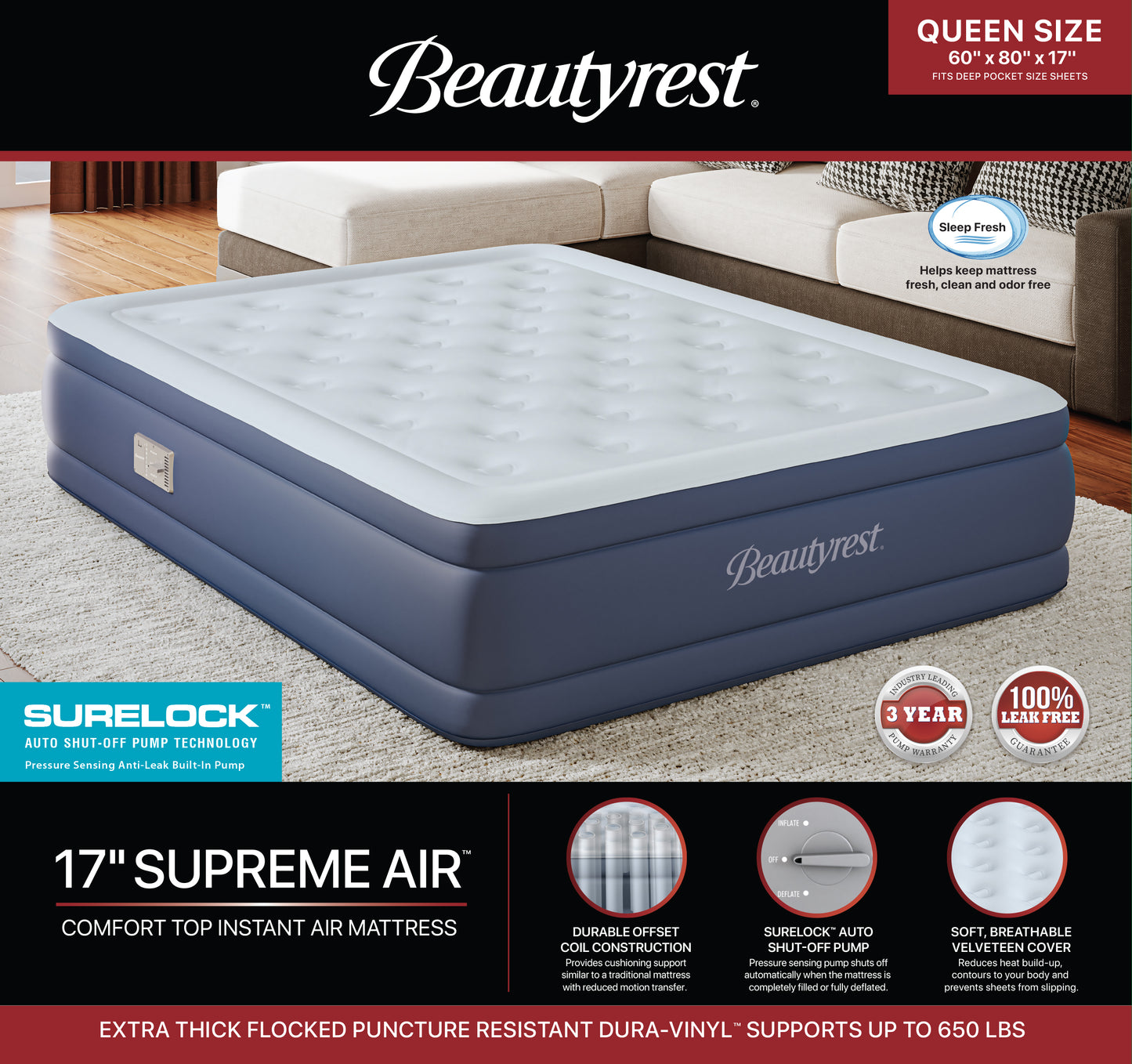 Relax and enjoy a great night’s sleep anywhere you go on the Beautyrest® Supreme Air™ Guest Bed. The offset coil construction and puncture resistant Dura-Vinyl™ cover ensure long lasting, durable use. The built-in pump inflates, deflates and adjusts for ideal comfort.